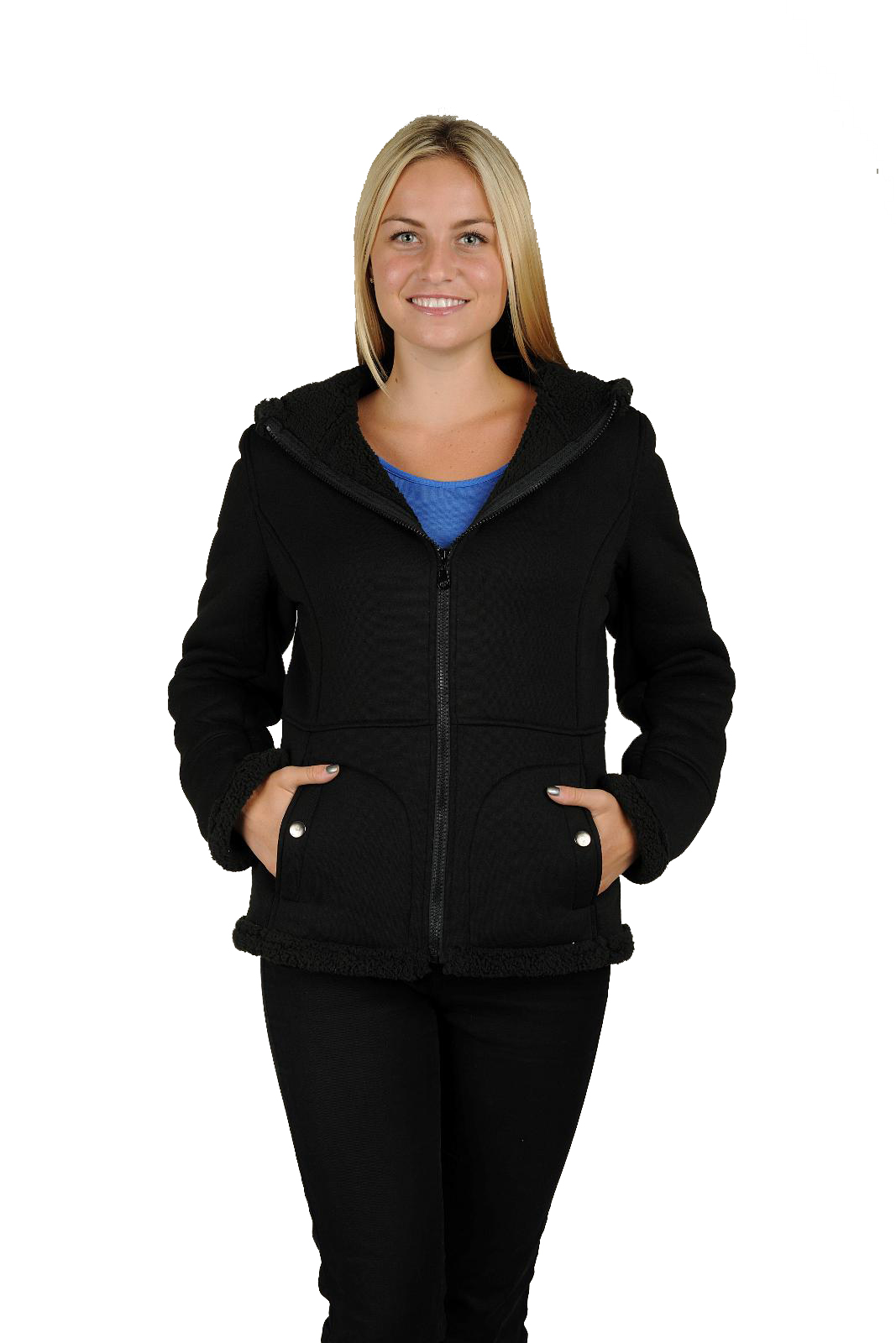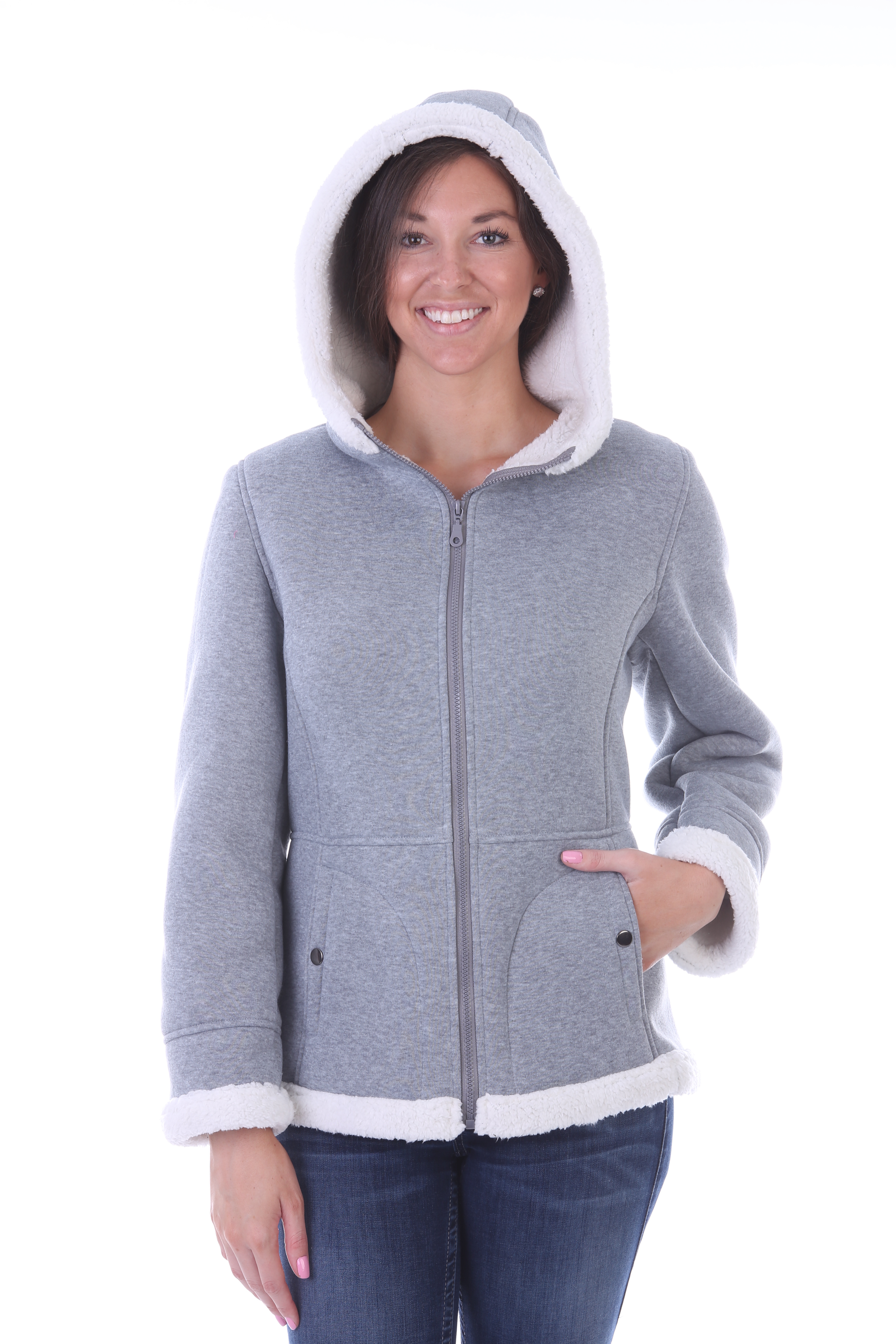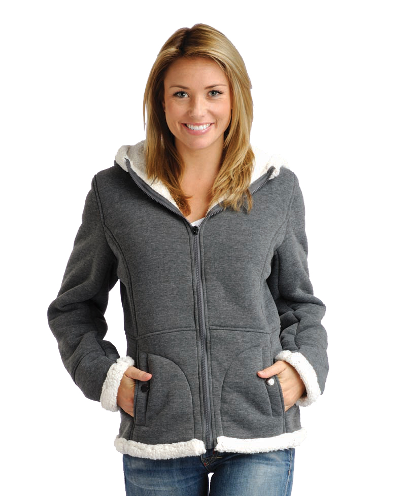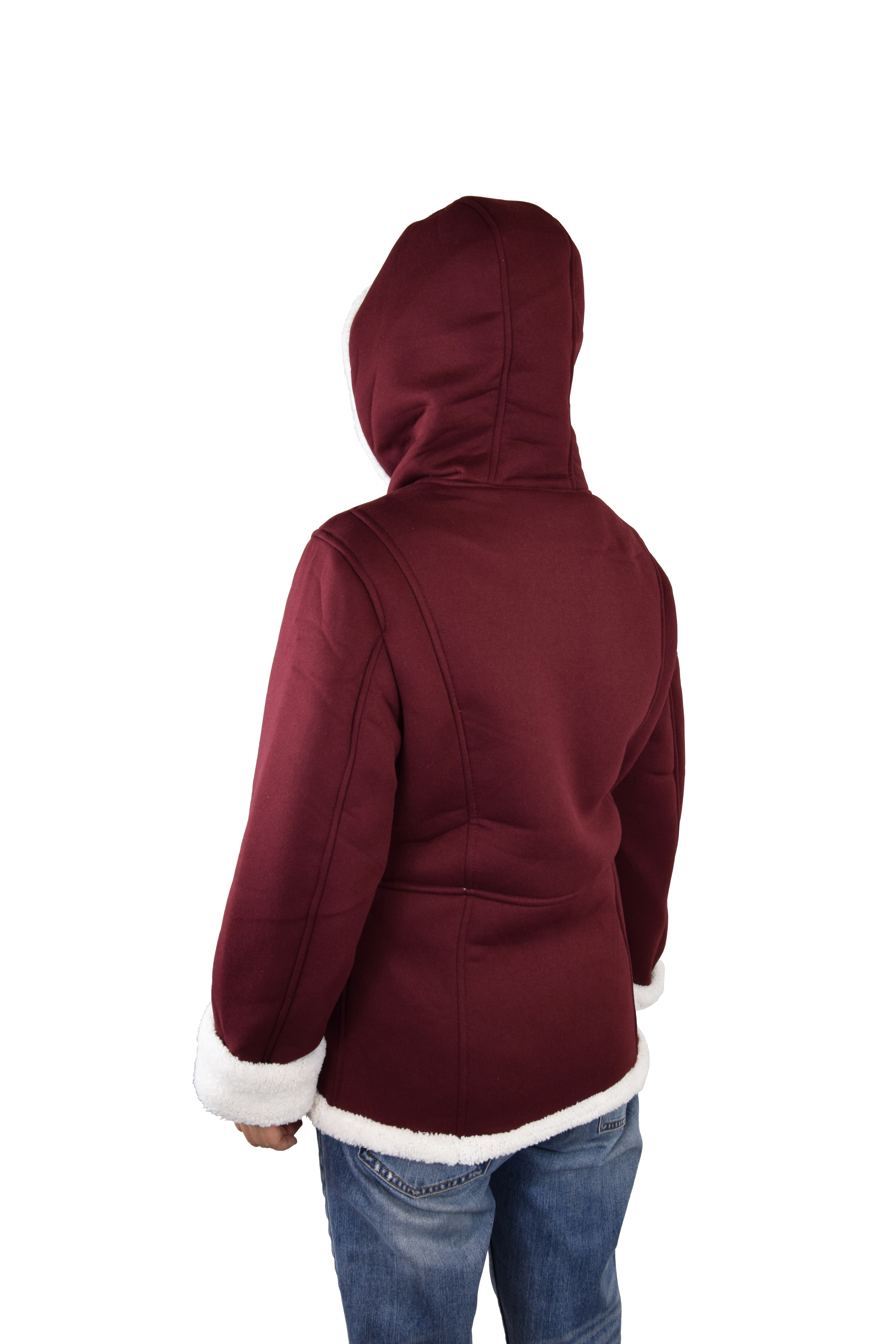 Ladies Poly Fleece Jacket With Bonded Baby Sherpa Lined Body And Sleeves. Attached Hood. Sherpa Trimmed Cuffs And Hem Bottom. Heavy Duty. Machine Wash & Dry. Imported.