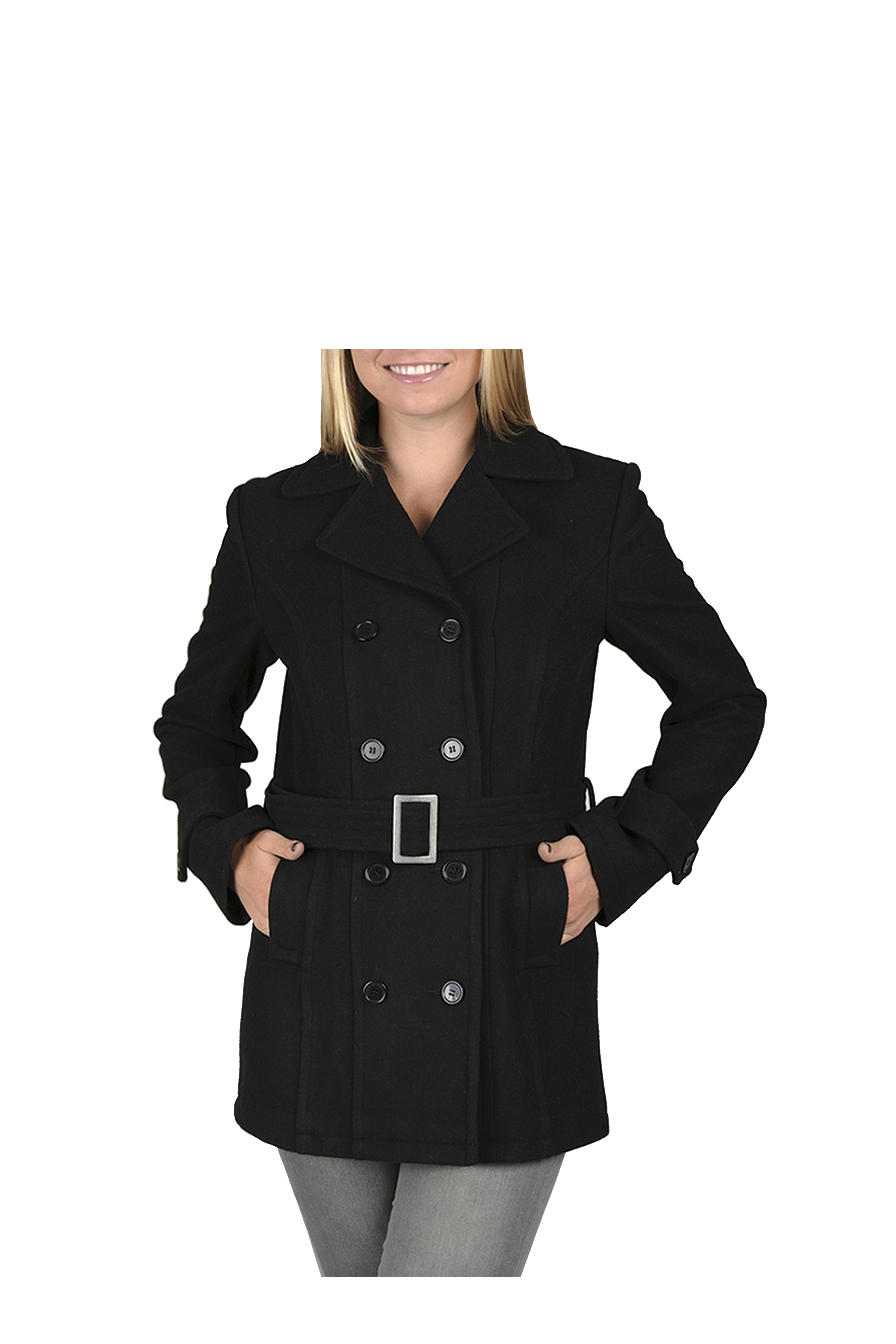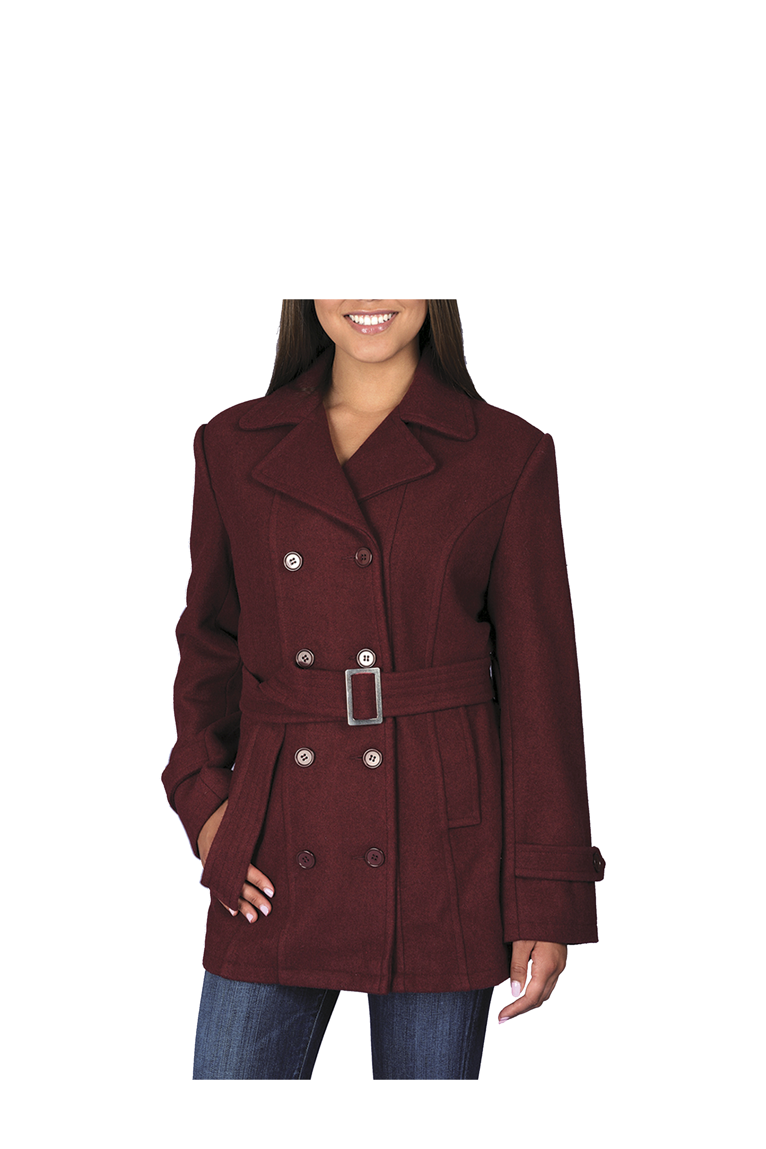 Maxxsel Ladies Mid-Length 55/45 Wool Blend Double Breast Pea coat. Belted Double Breast, Poly Filled Poly Lining, Front Welt Pockets, And Tab Detailed Sleeves. Dry Clean Only. Imported.